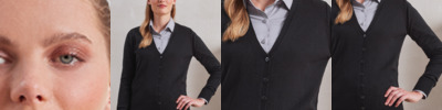 100% acrylic. Fine knit. Easy care. Soft feel and contemporary styling. Set in sleeves. Ribbed knit neck, cuffs and hem. Self colour buttons.
