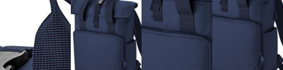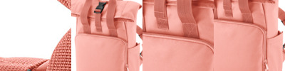 100% recycled 300D polyester. Webbing carry handles. Padded adjustable shoulder straps. Roll-top closure. Padded back panel. Padded laptop compartment compatible up to 15.6". Large front zip pocket with organiser section. Internal zip pocket. Water bottle pocket. Tear out label. Capacity 19 litres.