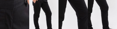 67% polyester/30% cotton/3% Lycra®. Narrow leg with flat front. Part elasticated waistband with belt loops. Zip fly. Two side pockets. Media pocket. Rear patch pocket. Domestic wash 65°C.