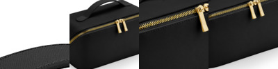 100% leather-look PU. Saffiano fine grain.Recycled PU backing and lining.Soft touch lining.High shine gold metal zip closure (black/black has a black metal zip).Internal zip pocket.Lay flat design.Multi-purpose use.Tear out label.Capacity 3.5 litres.