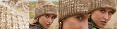 50% recycled polyester/50% acrylic. Heavyweight multi yarn design. Engineered crown. Double layer turn up cuff. Reverse knit cuff for decoration (15 x 5cm). Tear out label.