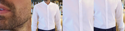 57% polyester/39% cotton/4% elastane. Tailored fit. Classic banded 'Grandad' collar. Back yoke. Two button cuffs with button on cuff gauntlet. Curved hem.