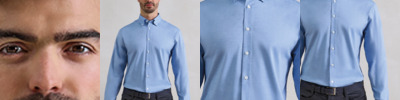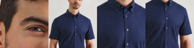 72% cotton/25% organic cotton/3% elastane. Mercerised cotton. Soft feel stretch fabric. Button down collar. Back yoke and pleats. Curved hem. Available in long sleeve PR284.