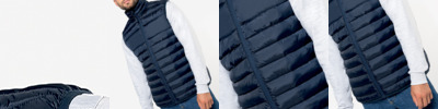 290T polyester outer. Polyester padding. Collar high full length nylon zip and pull. Two front zip pockets. Two inner pockets. Hanging loop. Elasticated bound armholes and hem. Tear out label. Packs away into storage bag.