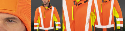 Three layer mechanical yarn bonded soft shell. Recycled polyester outer layer. Waterproof 8000mm, breathable 1000g and windproof TPU membrane. Recycled polyester micro fleece inner layer. Conforms to EN ISO 20471: 2013 + A1: 2016 class 2. Stand up collar. Full length heavy duty recycled zip with outer storm flap and inner zip guard. Hanging loop. Right chest pocket. Two reflective printed bands around the body, sleeves and one over each shoulder. Two front pockets. Contrast panels. Shaped back hem. Part elasticated, tear release cuffs. Tag free. Access for decoration.